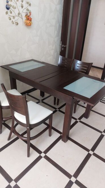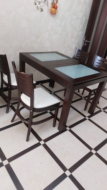 Dəst bir-birinə uyğun komplekt kimi təqdim olunur: genişlənən şüşə panelli masa + 4 stul.