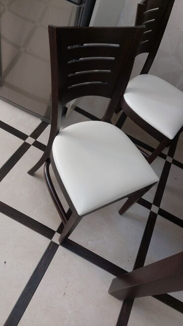 - Stullar: uyğun tünd ağac karkas, arxalıq hissədə dekorativ üfüqi yarıqlar; oturacaq hissəsi ağ rəngli, yumşaq döşəmə