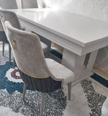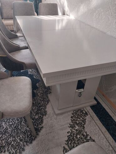 Ağ rəngdə geniş yemək masası və 6 ədəd kreslo dəsti.