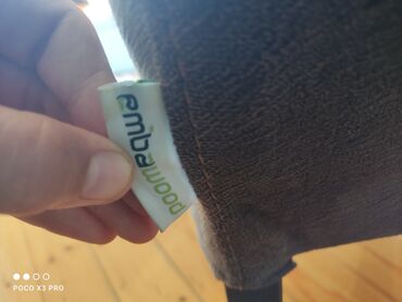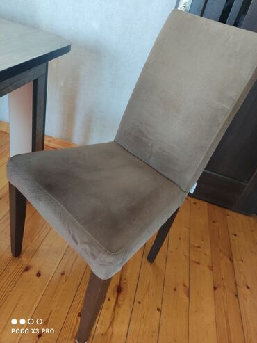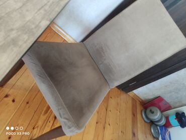 - Stullar: yumşaq süet-effektli parçayla üzlənmiş, qəhvəyi/bej tonlarında. Hündür bel dəstəyi, komfortlu oturacaq, tünd taxta ayaqlar. Etiketdə “embawood” markası görünür.