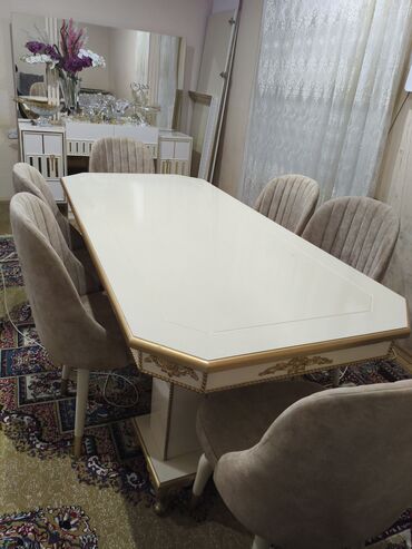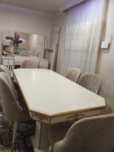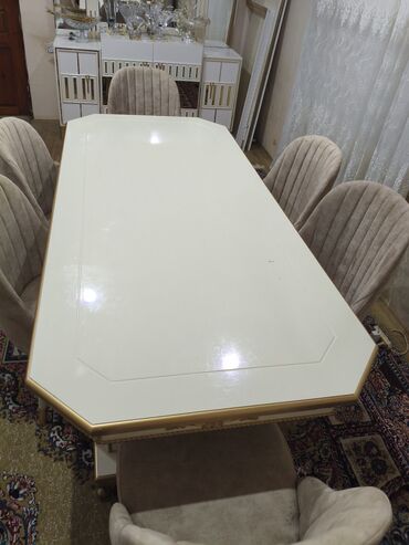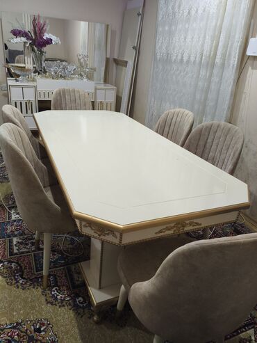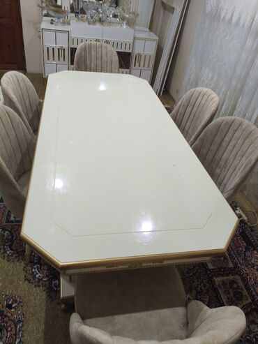- Rəng: krem/ağ masa üstü, qızılı haşiyə; stullar bej məxmər/parça üzlüklü