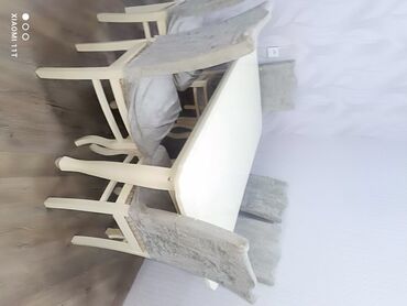 Ağ rəngli yemək masası və 6 ədəd stul dəsti. 1 il istifade olub Xüsusiyyətlər: - Düzbucaqlı masa, klassik dizaynlı oyma bəzəklərlə - 6 ədəd uyğun stul: yumru arxalı, yumşaq süngərli oturacaq - Neyt...