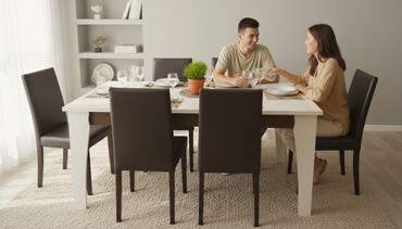 - Masa: düzbucaqlı formalı, hamar və parlaq üst səth, qalın dayanıqlı ayaqlar. Ailə yeməkləri və qonaqlamalar üçün geniş istifadə sahəsi.