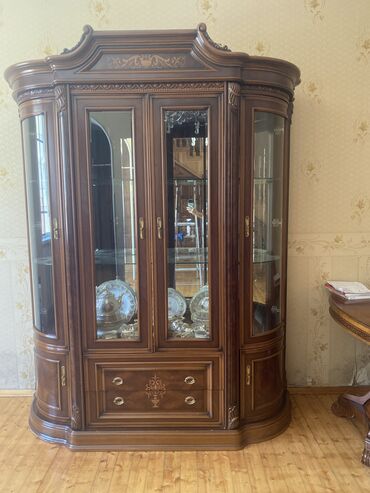 Zərif klassik üslubda mebel dəsti - Vitrin şkaf: Önü şüşəli, üç rəfli konstruksiya. İç hissəsi işıqlı görünüşə uyğun şüşə rəflərlə (qab-qacaq, dekor və kolleksiya əşyaları üçün ideal). Korpus krem...