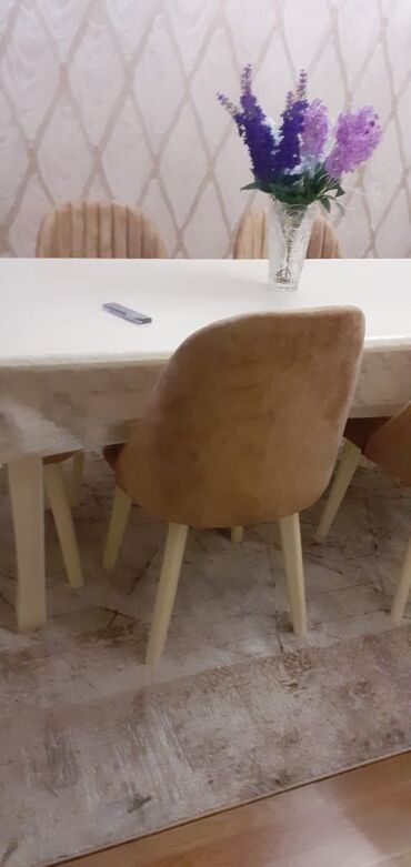 - 6 ədəd stul: yumşaq, samrın-bej rəngli parçalı oturacaq və bel hissəsi; ağ-krem rəngli taxta ayaqlar. Ergonomik arxa dayağı sayəsində rahat oturuş təmin edir.