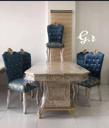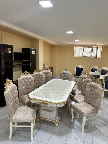- 6/8 ədəd yüksək bel kürsü: düyməli kapitone işləmə, qızılı tac/gül formalı başlıq bəzəkləri, yumşaq oturacaq; ağ rəngli taxta karkas və əyri formalı ayaqlar.