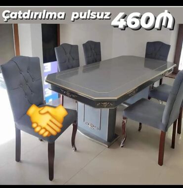 Yemək/Qonaq otağı üçün masa-stul dəstləri 1) Boz-qızılı detallı klassik dəst - 1 ədəd iri, çoxbucaqlı formalı yemək masası - 6 ədəd yüksək bel, düyməli-kapitone işləməli stul - Masa üstü parlaq sə...