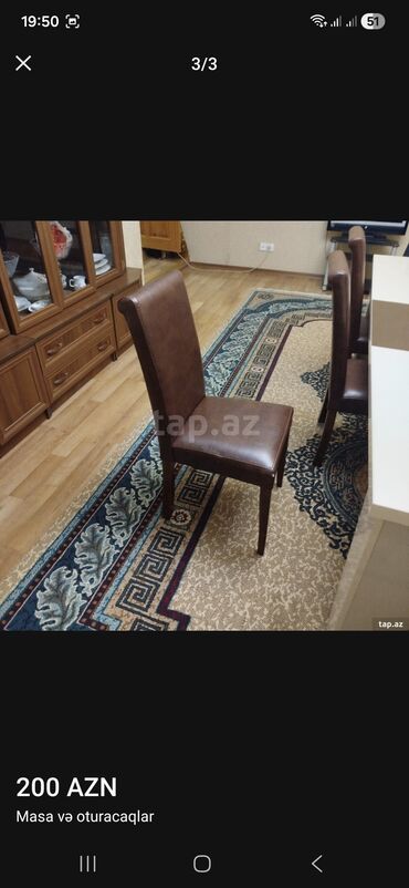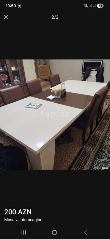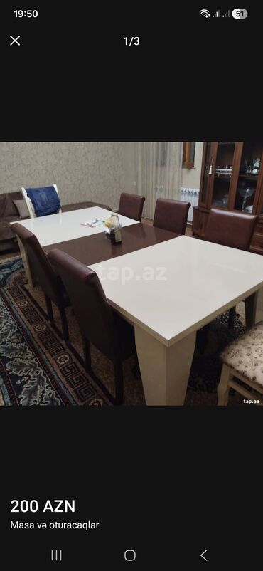 Qiymət: 200 AZN (şəkildə göstərilib). Məhsul: “Masa və oturacaqlar”.