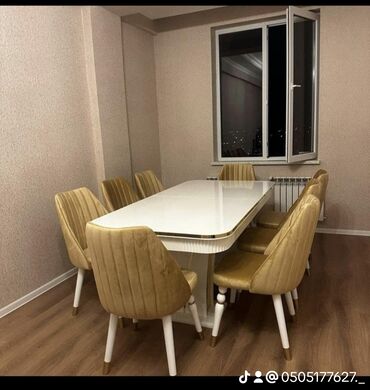 Möhkəm və zərif yemək dəsti – müasir interyerlər üçün ideal seçim. - Rəng: ağ parlaq masa üstü, bej rəngli yumşaq oturacaqlı stullar - Komplekt: masa + 6 və ya 8 stul - Dizayn: ortası güzgü effekt...