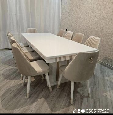 Yemək masası və stul dəsti - Müasir-minimalist dizayn: oval və düzbucaqlı formalı, parlaq ağ masaüstü; xətli (ribli) silindrik və ya dördayaqlı baza variantları. - 6–8 nəfərlik yerləşim: şəkillərd...