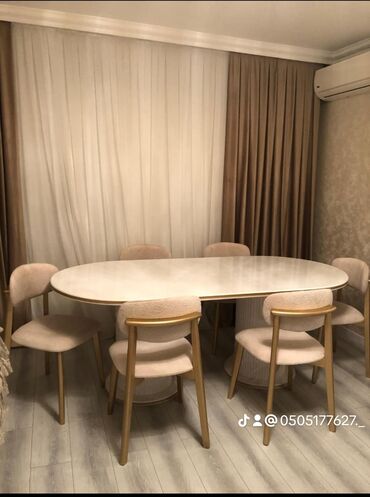 Zərif klassik üslubda yemək otağı dəsti. - Komplekt: 1 süfrə masası + 6 stul - Masanın üstü mərmər naxışlı, kənarları qızılı dekor elementləri ilə işlənib - Rəng: açıq krem/bej tonları, qızılı orna...