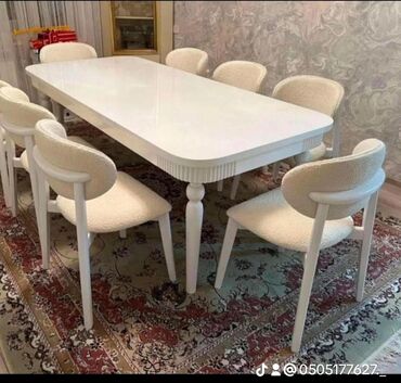 Yemək masası və stul dəsti - Müasir-minimalist dizayn: oval və düzbucaqlı formalı, parlaq ağ masaüstü; xətli (ribli) silindrik və ya dördayaqlı baza variantları. - 6–8 nəfərlik yerləşim: şəkillərd...