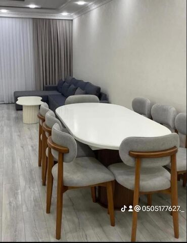 Yemək/Qonaq otağı üçün masa-stul dəsti - Stil: Müasir, yumru künclü oval və dairəvi üstlü masa; bordürlü, reliyefli silindrik ayaq(lar). Minimalist xəttlər, skandivav motivləri. - Materiallar: -...