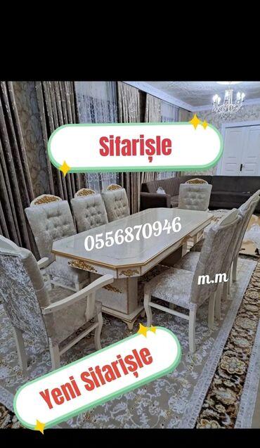 - Klassik üslublu uzun masa + 8 ədəd yüksək bel, qızılı ornamentli, yumşaq oturacaqlı stullar. Masa üstü dekorativ kənarlı, oyma detallı baza; interyerə klassik zəriflik qatır.