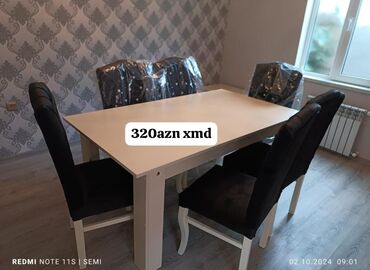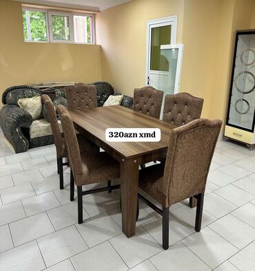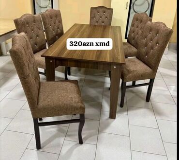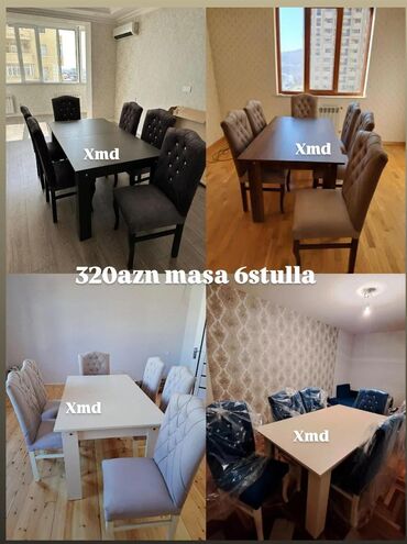 Şəkillərdə göstərilən modellər eyni komplekt prinsipindədir: masa və 6 ədəd uyğun dizaynlı stul.