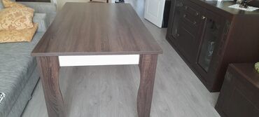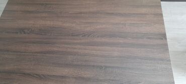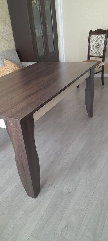- Masanın materialı: tünd qəhvəyi ağac naxışlı laminat/sunta, hamar və asan təmizlənən səth
