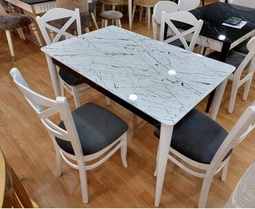 - 4 ədəd ağ karkaslı, yumşaq oturacaqlı stul