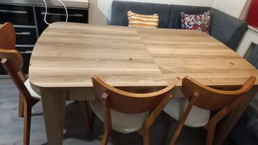 - Uzadıla bilən yemək masası – ağac teksturalı səth, yumşaq radiuslu künclər, 4 möhkəm ayaq. İki hissəli üstü sayəsində uzunluğu artırıla bilir, ailə və qonaqlar üçün rahatdır.