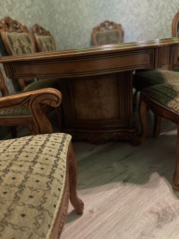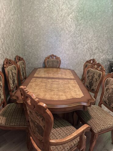 Yemək otağı dəsti – masa və 6 ədəd stul - Klassik üslubda, qəhvəyi rəng palitrasında. - Masa: düzbucaqlı forma, yumşaq künclər, oyma üslublu ayaqlar. Üst hissə dekorativ naxışlı taxta teksturası v...