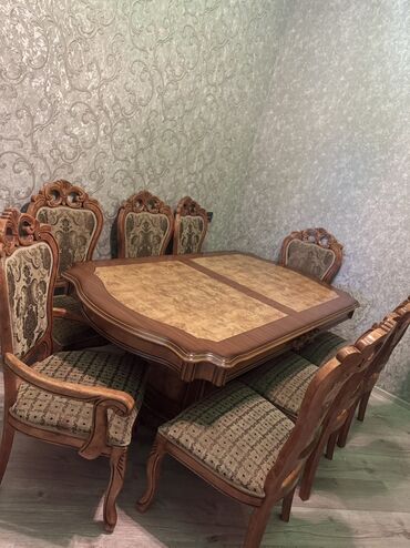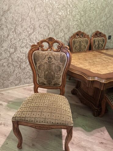 Klassik üslubda yemək otağı dəsti. - Masa: düzbucaqlı formalı, taxta karkaslı, üstü dekorativ marmar naxışlı panel ilə bəzədilmiş. Üst hissə şəffaf qoruyucu plyonka ilə örtülüb. Küncləri yumşaq xə...