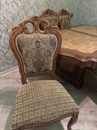 Klassik üslubda yemək otağı dəsti - Tərkibi: 1 ədəd böyük yemək masası + 8 ədəd kürsü (2-si qollu, 6-sı qolssuz) - Dizayn: Barokko/Royal üslubunda oyma naxışlar, qızılı rəngli çərçivə və bəzəklər ...