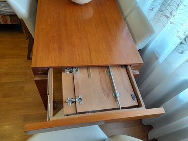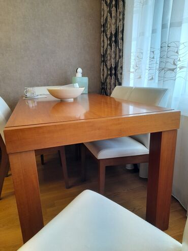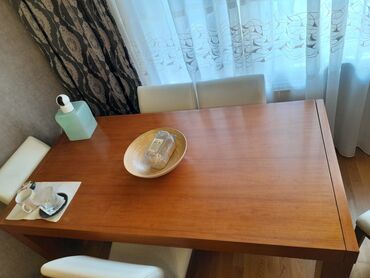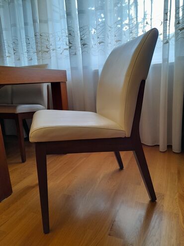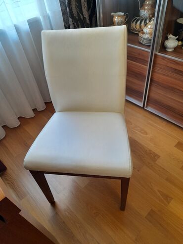 - Stullar: 6 ədəd, yumşaq oturacaq və bel hissəsi, krem rəngli dəri/eko-dəri üzlüklə. Arxa hissə ergonomik əyriliyə malikdir, oturma rahatlığı yüksəkdir.
