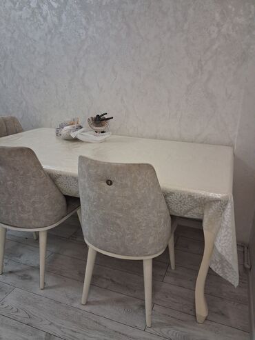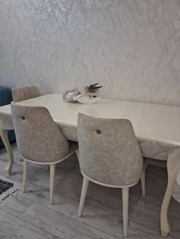 - Düzbucaqlı yemək masası: krem rəngli, zərif oyma formalı əyri ayaqlar, üstü süfrə və şəffaf qoruyucu plyonka ilə örtülüb. Ailə yeməkləri və qonaqlama üçün geniş səth.