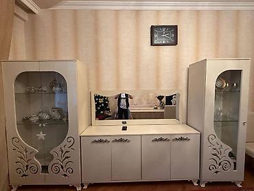 • 2 ədəd vitrın şkafı – şüşə qapılı, daxildə şüşə rəflər, dekorativ oyma elementləri, qab-qacaq üçün vitrin