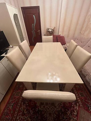 • 6 ədəd yemək stulu – krem rəngli, yumşaq süni dəri oturacaq və söykənəcək