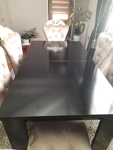 - Masa: Parlaq qara səthli düzbucaqlı yemək masası. Geniş ölçülü üstlük, düz xətlərə malik minimalist dizayn, möhkəm ayaqlar. Ailə yeməkləri və qonaqlamalar üçün rahat istifadə oluna bilər.