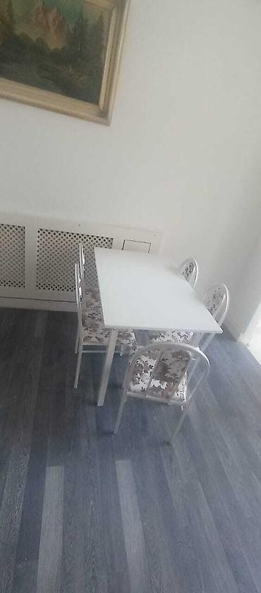 Ağ rəngdə dörd nəfərlik stol və dörd ədəd çiçək naxışlı oturacaqlı stul dəsti. Dəst, yemək otağı və ya mətbəx üçün uyğundur. Stollar kvadrat formasındadır və yüngül materialdan hazırlanıb, daşınması asandır. Stullar metal konstruksiyaya malikdir və oturacaqları rahatdır.
