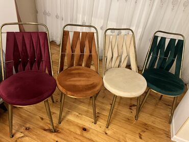 - Stullar: 4 ədəd. Metal karkas və konusvari ayaqlar (qızılı/bronz ton). Yumru oturacaq, məxməri/parça üzlüklə.