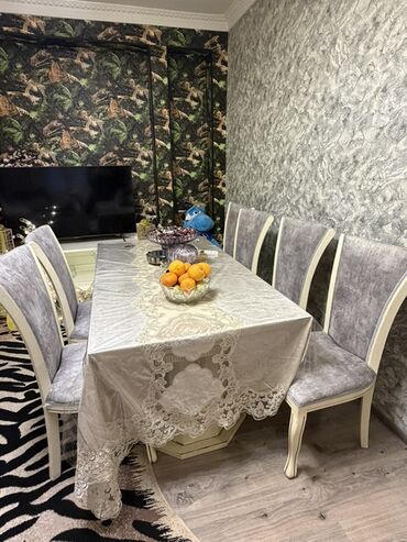 Klassik üslubda geniş yemək və qonaq otağı dəsti. - Yemək masası: Uzunsov, naxışlı üst səth və şəffaf qoruyucu örtük. Elegant ornamentli konturlar, yumşaq bucaq formaları. - Stullar: 12 ədəd, yüks...