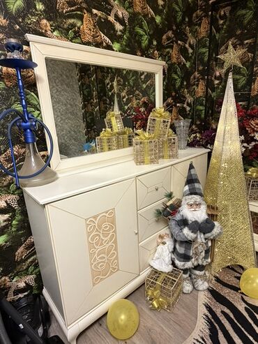 - Bufet-komod: krem rəngdə, fasadda oyma ornament panelləri, 1 böyük qapı, 3 siyirmə və əlavə yan qapı; üst hissədə iri çərçivəli güzgü.