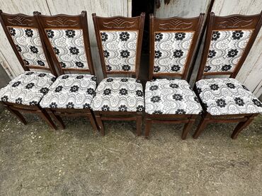 - Rəng: tünd qəhvəyi (ağac teksturası), oturacaq və arxa hissə ağ-qara çiçək naxışlı parça