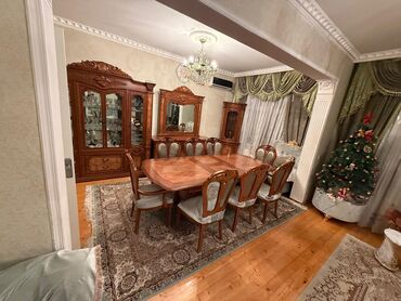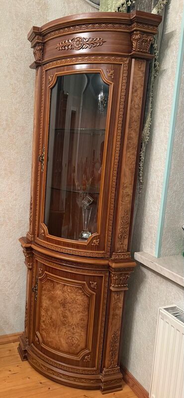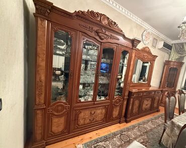 - Böyük vitrin şkafı – 4 qapılı, şüşəli bölmələr, içəridə şüşə rəflər, alt hissədə çekmecələr və qapalı bölmələr
