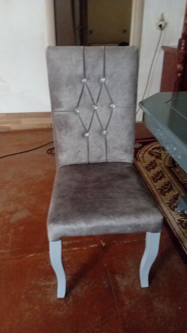 - Stullar: boz məxmərəoxşar parça ilə döşənmiş, arxalıq hissəsində dekorativ düyməli romb tikişləri; ağ-boz rəngli, yüngül əyri taxta ayaqlar.