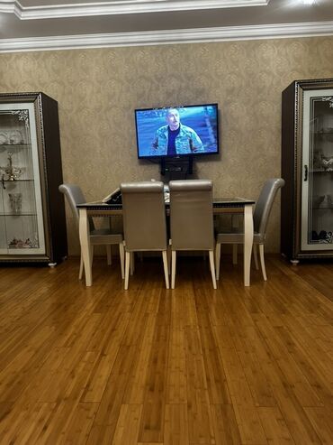 - Masa və 6 ədəd yumşaq kürsü: krem-boz rəngli oturacaqlar, ağ-qara çərçivəli masa üstü dekorativ işləmələrlə.