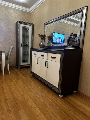 - Komod və böyük güzgü: 3 çekmece + 4 qapılı bölmə, geniş saxlama imkanı. Üst hissədə iri çərçivəli dekorativ güzgü.