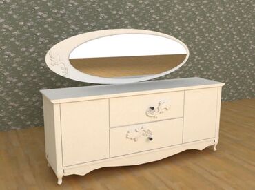 - Servant/kredenza: İki qapalı bölmə və iki geniş çekmece; üzərində oval güzgü. Fasadlarda dekorativ relyeflər və sap daşlı tutacaqlar.