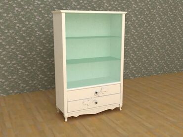- Vitrin şkafı: Şüşəli ön hissə, iki geniş rəf, aşağıda iki çekmece; dekorativ ayaqlar.
