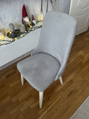 Zərif dizaynlı yemək otağı stulu - Rəng: açıq boz/gümüş tonlarında, məxmər teksturalı parça - Oturacaq və arxalıq: yumşaq süngərləmə, bel hissədə əyimli “kanat” formalı arxa dəstək; arxada dekorat...