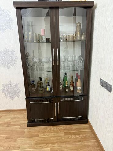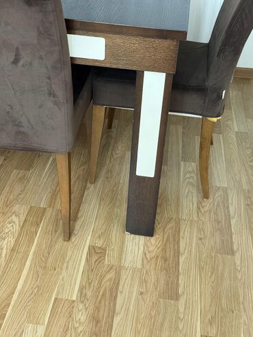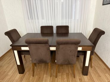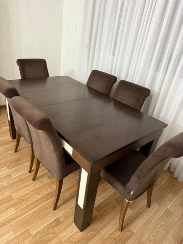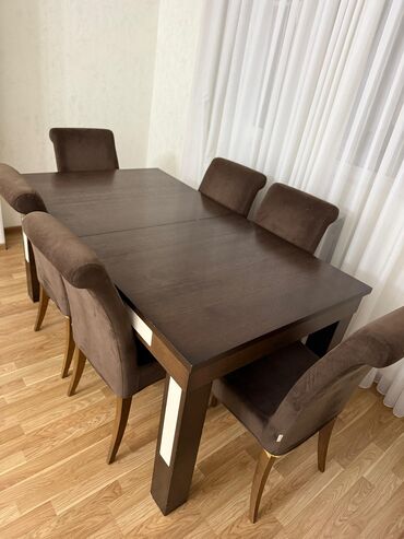 - 6 ədəd uyumlu stul: yumşaq, məxməri toxumalı parça üzlük, qəhvəyi rəng, əyri taxta ayaqlar, arxa hissəsi rahat dəstəkli