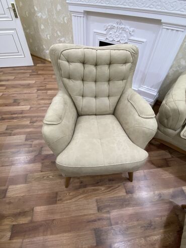 - 6 ədəd yumşaq oturacaqlı kreslo: bej rəngli məxməri/parça üzlük, kürəyi yumru formalı, taxta ayaqlar