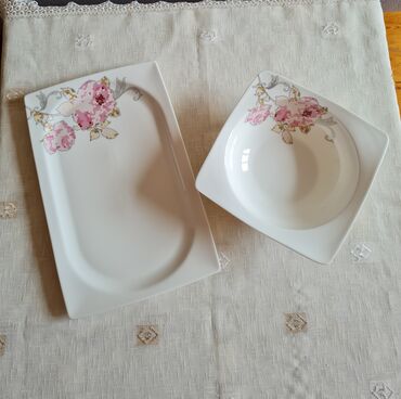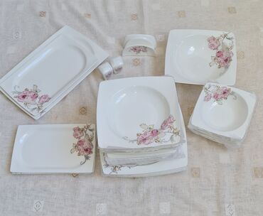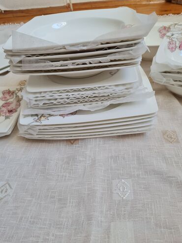 Türkiyənindir.6böyük,6orta,6balaca boşqab,6kasa,1opşi boşqab,1böyük bulud,1balaca bulud,2salat qabı,1salfetka və duz-istiot qabı.Qırığı,çartlağı heç bir problemi yoxdur. Ünvan Bakıxanov.