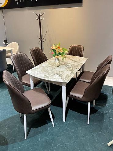 - Mərmər naxışlı üstlü masa və tünd qəhvəyi-yumşaq oturacaqlar, bel hissəsində dekorativ tikişlər.