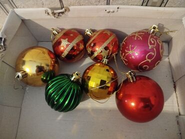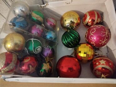 Yeni il ağacı üçün oyuncaq dəstləri - 9-luq qutular: Hər qutuda 9 ədəd sfera formalı bəzək. Müxtəlif rəng və naxış kombinasiyaları: • Qırmızı–yaşıl–ağ: parıltılı şevron xəttlər, şam ağacı motivl...
