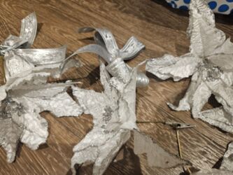 - Gümüşü dekor elementləri: böyük poinsettia/zambaq formalı çiçək bəzəkləri və lentdən hazırlanmış gümüş kəpənəklər. Tel əsaslıdır, forma vermək və istənilən yerə bərkitmək asandır.
