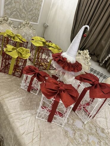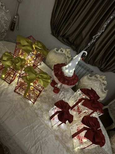- İşıqlı hədiyyə qutuları: Məş şəbəkəli karkas, iç hissədə isti ağ LED işıqlar. İki rəng kombinasiya: