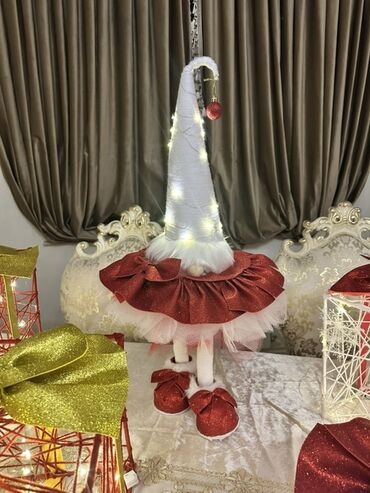 - Şaxta baba-cırtdan fiquru: Uzun ağ papaqlı, papaqda LED işıq zolağı və qırmızı oyuncaqlı asma, tütülü qırmızı ətək və uyğun balaca tuflilər. Masaüstü dekor kimi nəzərdə tutulub.